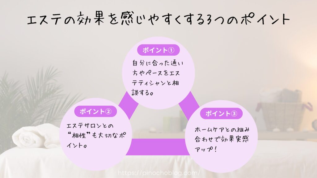 しかし、エステの効果を最大限に引き出すには、ちょっとしたコツがあります。エステの効果を感じやすくする3つのポイントを紹介します。